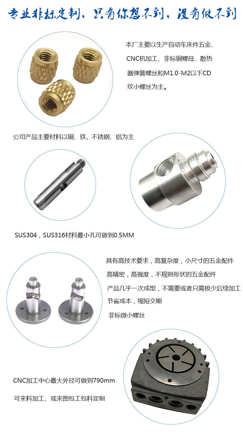公司主要生产各类CNC车床件五金加工、自动车床件五金加工、加工不锈钢CD纹螺丝、散热器台阶弹簧螺丝、滚花螺丝、 圆形螺母、滚花铜螺母/预埋镶嵌铜螺母(卡件)、铸件加工、 点胶机配件、点胶阀等产品.公司产品主要材料以铁,不锈钢,铝,铜为主。