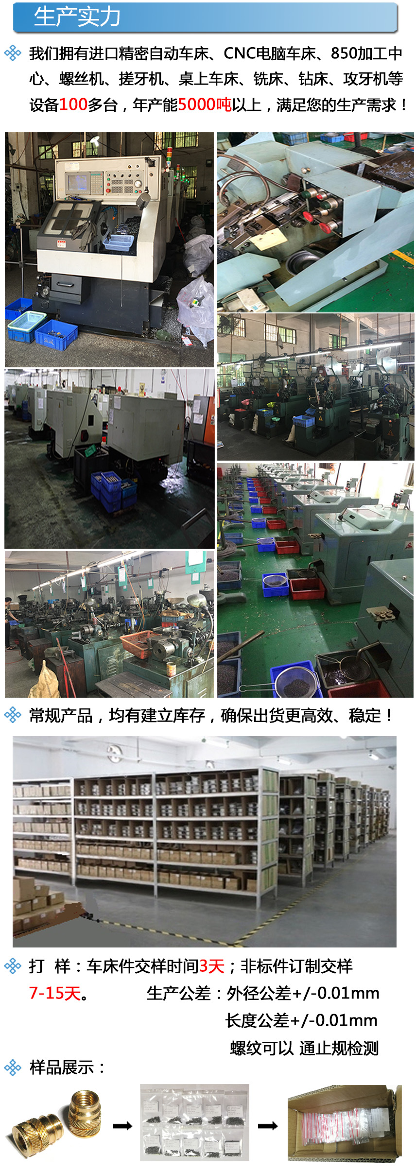 拥有100多台台湾精密自动车床、CNC电脑车床、850加工中心、螺丝机、桌上车床、铣床、钻床、攻牙机等设备。拥有多年的生产技术经验,配备先进的生产设备和一支以科技为重心的优秀工程技术团队,并实行全面品质化管理,以优秀的品质和最好的状态诚为贵公司精确、快捷、优质的服务.