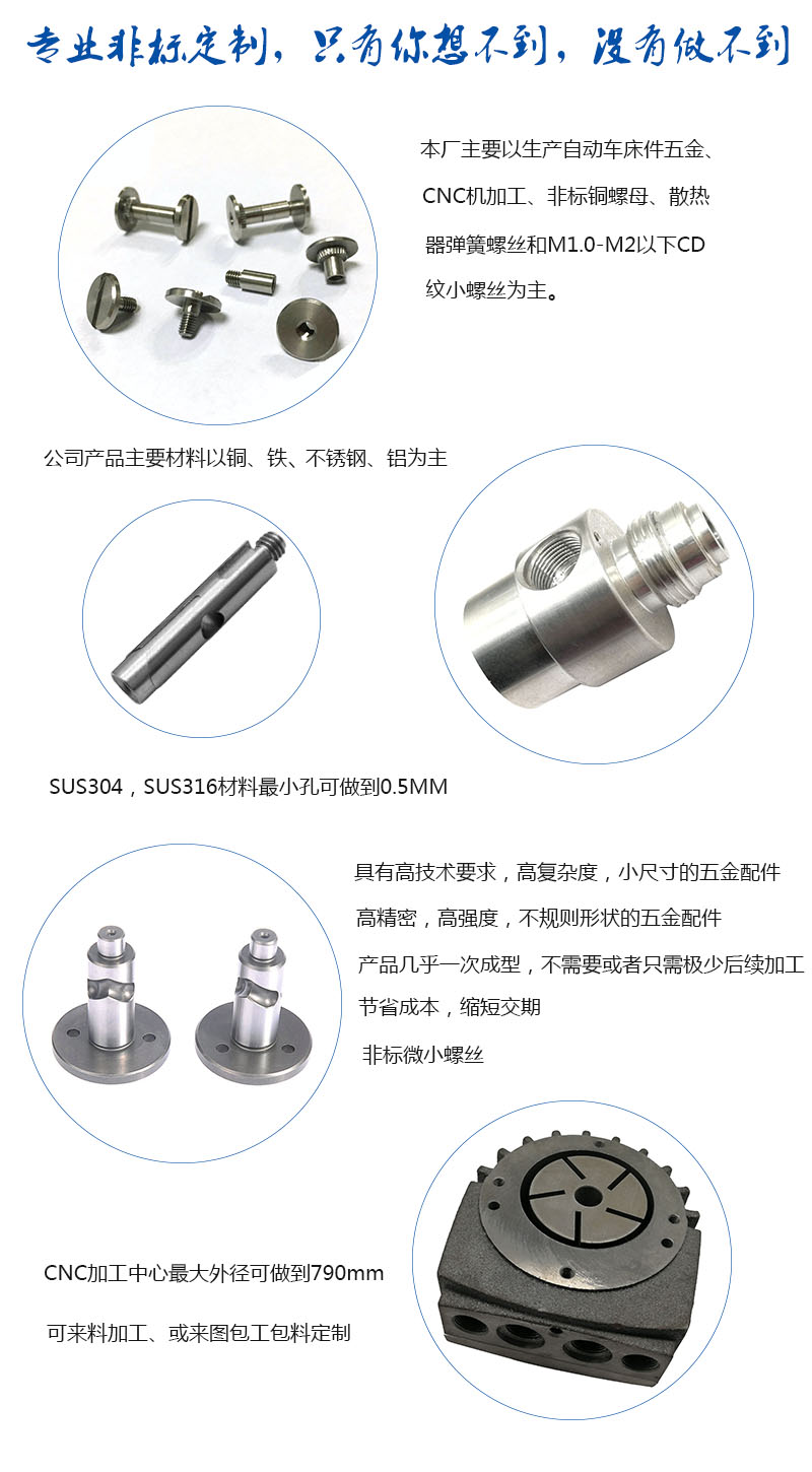 公司主要生产各类CNC车床件五金加工、自动车床件五金加工、加工不锈钢304CD纹电子小螺丝、散热器台阶弹簧螺丝、球头螺丝、滚花螺丝、 圆形螺母、滚花铜螺母/预埋镶嵌铜螺母(卡件)、铸件加工、 点胶机配件、点胶阀等产品.公司产品主要材料以铁,不锈钢,铝,铜为主。