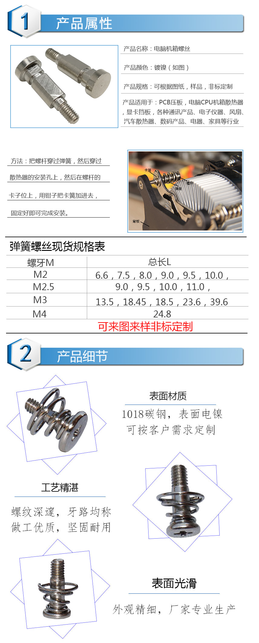 、散热器台阶弹簧螺丝、球头螺丝、滚花螺丝、滚花铜螺母、铸件加工 、点胶阀等非标订制产品