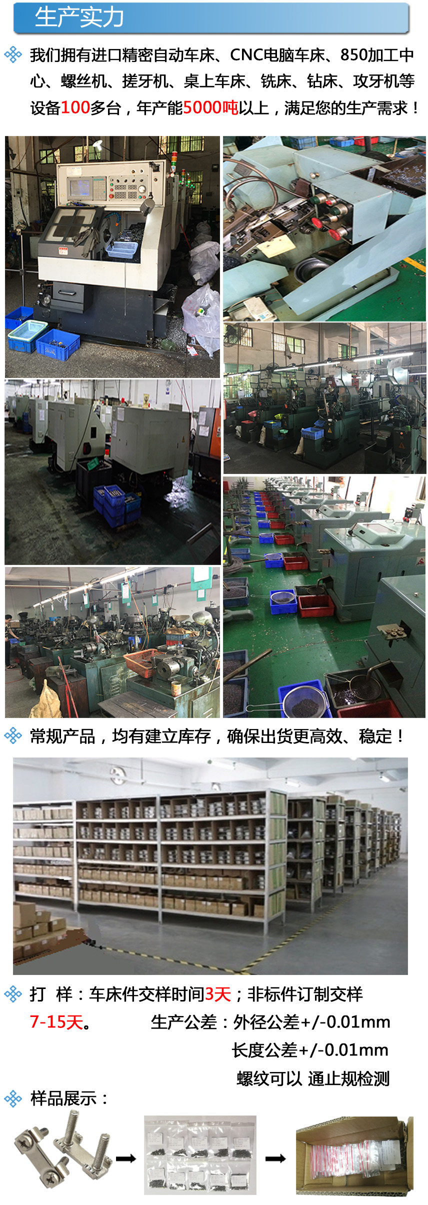 公司主要以铁,不锈钢,铝,铜材料为主。生产各类CNC五金车床件、自动车床件、加工304不锈钢CD纹、电子小螺丝、散热器台阶弹簧螺丝、球头螺丝、滚花螺丝、滚花铜螺母、铸件加工 、点胶阀等非标订制产品. 广泛适用于:散热器,通讯设备,高科技电子产品,钟表,汽车,自行车,玩具,电动车,电子电器,电动工具类,箱包,塑胶配件,家私,医疗器材,园艺工具,灯饰,运动器材等其它领域。