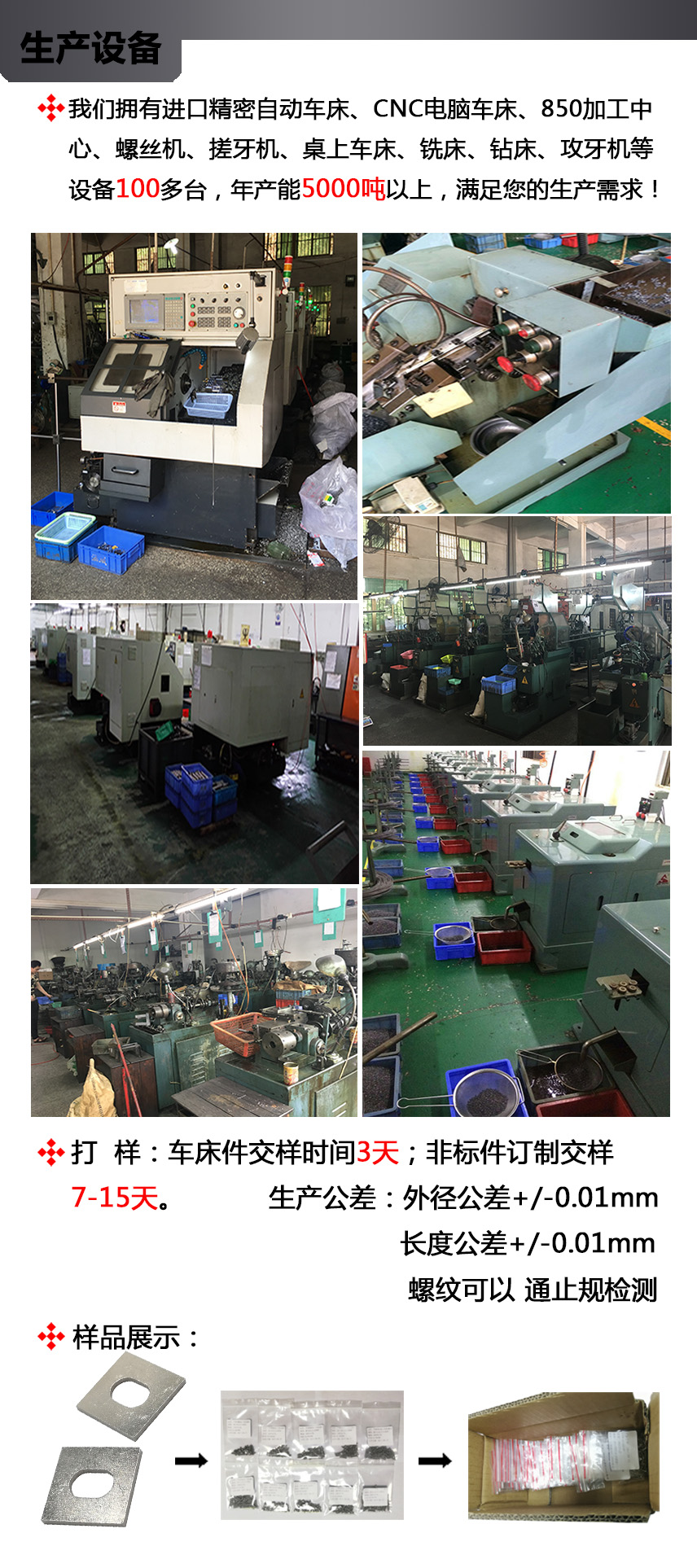 公司主要以铁,不锈钢,铝,铜材料为主。生产各类CNC五金车床件、自动车床件、加工304不锈钢CD纹、电子小螺丝、散热器台阶弹簧螺丝、球头螺丝、滚花螺丝、滚花铜螺母、铸件加工 、点胶阀等非标订制产品. 广泛适用于:散热器,通讯设备,高科技电子产品,钟表,汽车,自行车,玩具,电动车,电子电器,电动工具类,相机周边配件,汽车五金零配件,箱包,塑胶配件,家私,医疗器材,园艺工具,灯饰,运动器材等其它领域。
