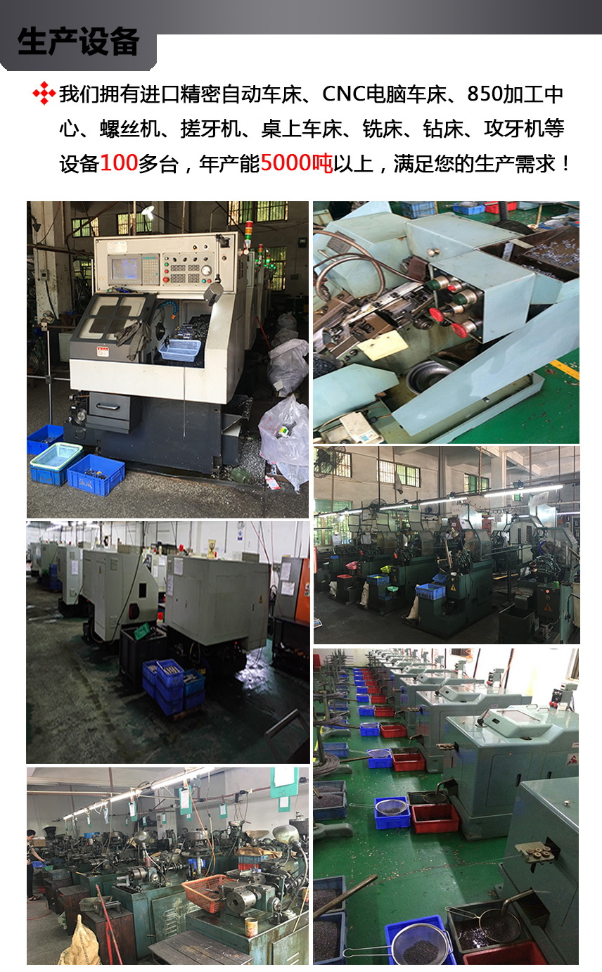 公司主要以铁,不锈钢,铝,铜材料为主。生产各类CNC五金车床件、自动车床件、加工304不锈钢CD纹、电子小螺丝、散热器台阶弹簧螺丝、球头螺丝、滚花螺丝、滚花铜螺母、铸件加工 、点胶阀等非标订制产品. 广泛适用于:散热器,通讯设备,高科技电子产品,钟表,汽车,自行车,玩具,电动车,电子电器,电动工具类,相机周边配件,箱包,塑胶配件,家私,医疗器材,园艺工具,灯饰,运动器材等其它领域。